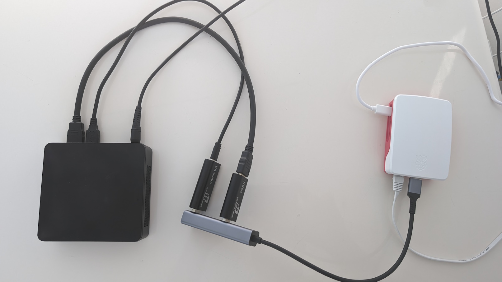 3. Plug the HDMI and USB cable from the dongles into the Target machine. (The Target machine in the image above is the black box – an Intel NUC running Ubuntu. This is the machine we want to remotely access and control)