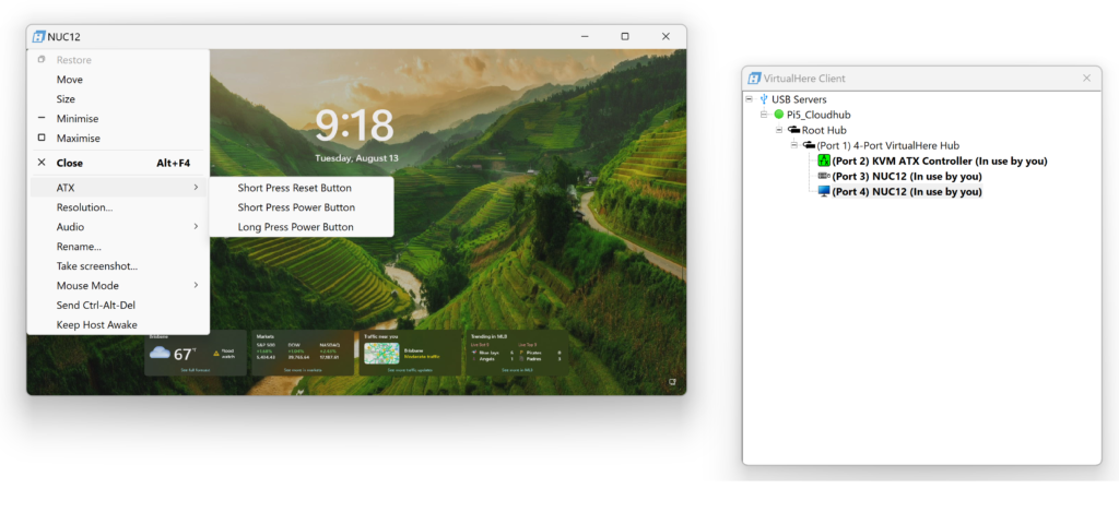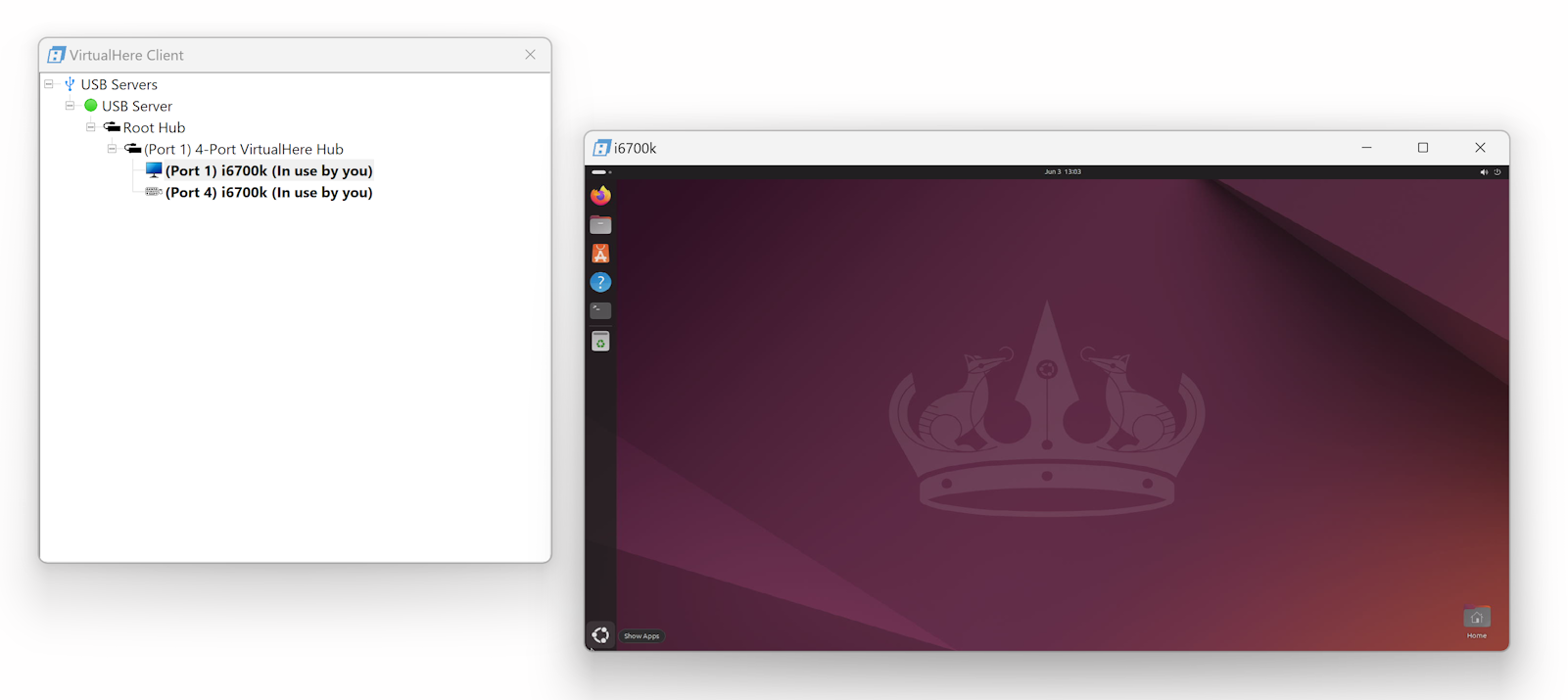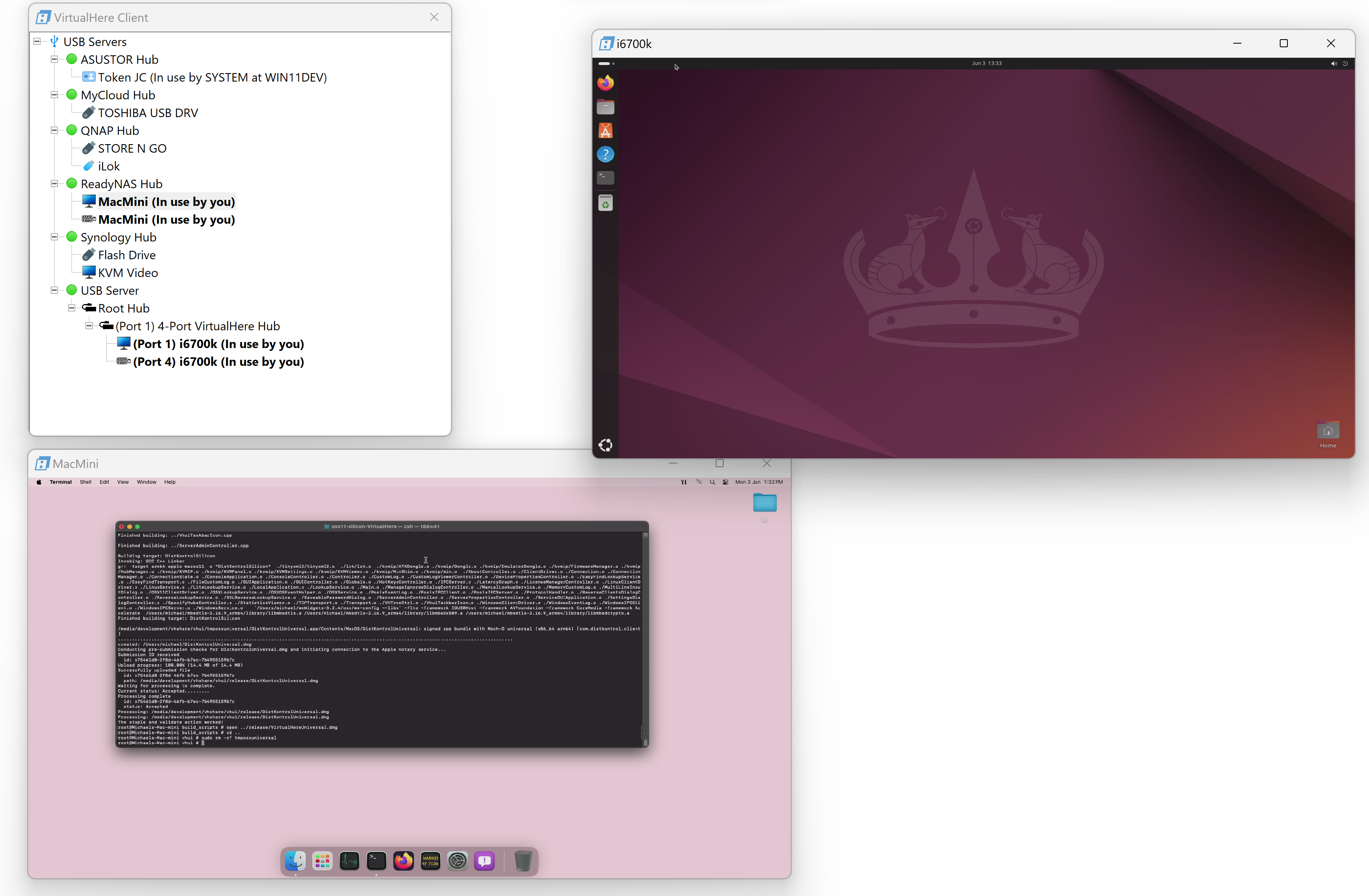 Here is a screenshot of a single machine running VirtualHere client connecting to two different KVM/IP Targets on the network simultaneously. Listed in the VirtualHere client are all the USB Servers on the network. Currently 6 USB servers are listed and two of them have KVM/IP dongles attached to Targets. The i6700k Target is the Ubuntu NUC as shown above and the other Target is a Mac Mini machine elsewhere on the network.