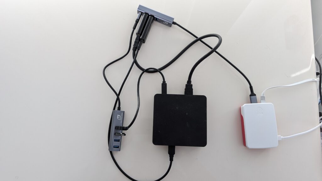 - Plug the VirtualHere USB Hub into a device running purchased VirtualHere Server software. (In the example image below this is a Raspberry Pi 5 running VirtualHere Server – the white box. The target is the black box, an Intel NUC). The server can be a Linux, MacOS or Windows machine that is nearby to the target(s).