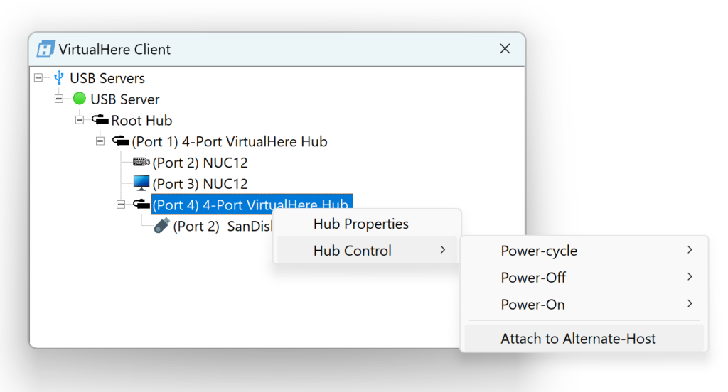6. Right click on the disk when you have finished copying and select Stop Using. Right click on the USB Server and select “Show Hubs”. Then right click on the lower 4-port VirtualHere Hub and select Hub Control ->Attach to Alternate Host