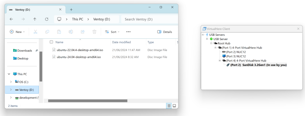 5. This will virtually mount the USB drive on the VirtualHere client machine and you can write/format the USB disk exactly as if it was directly plugged into the client machine. In the example above we have copied over two ISOs – Ubuntu 22.04 and Ubuntu 24.04