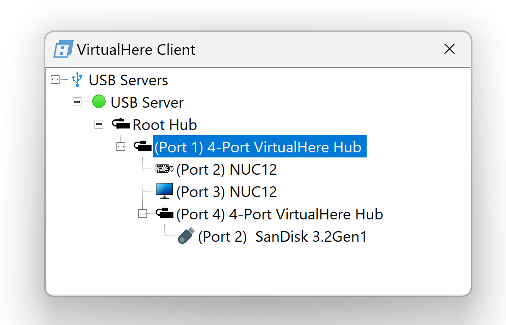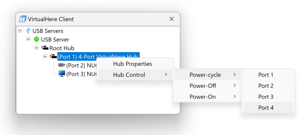 The VirtualHere Modular KVM/IP system can virtually pass back and forth USB devices from the Server to any VirtualHere client on the network using its built-in USB over IP functionality. However, the VirtualHere USB Hub is unique in that it can also redirect USB devices physically. It can dynamically switch the USB electrical signals to come out of the USB Hub on Port 1, instead of the upstream port.