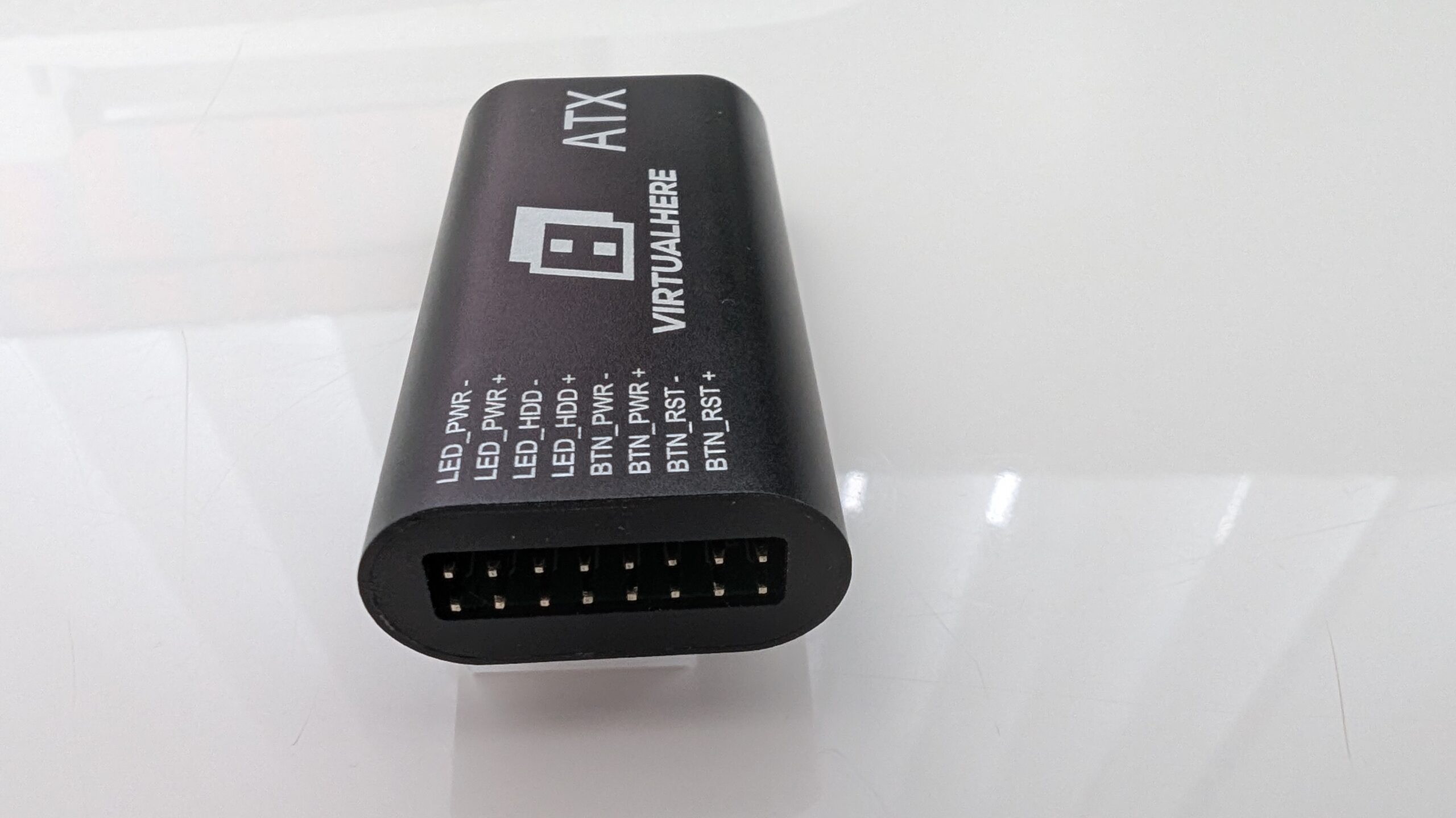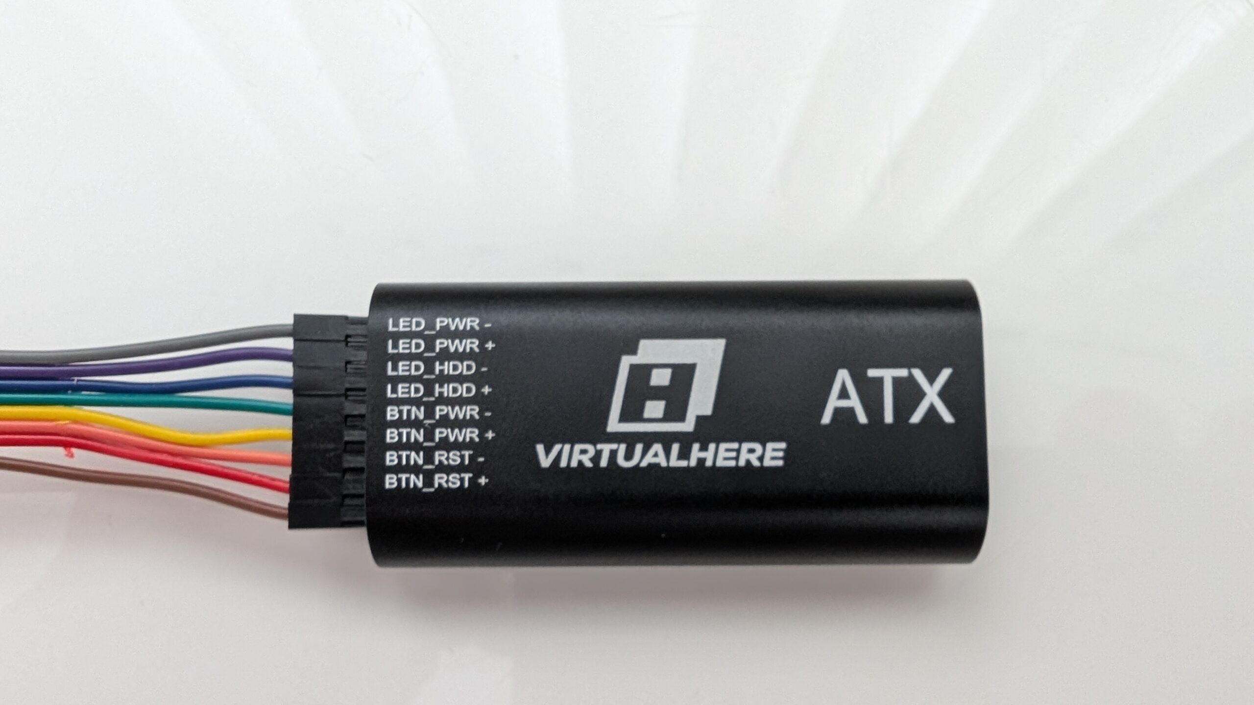 This dongle (2cm * 5cm) will allow you to remotely control the Power and Reset buttons on a PC or NUC.